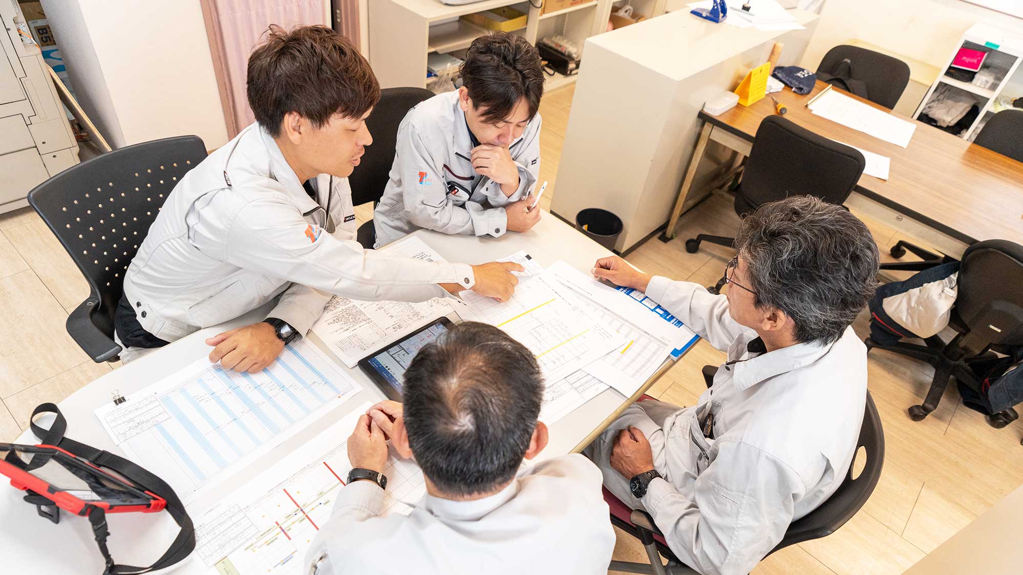 工事現場では高い場所で作業したり様々な工具を使うことも多いです。安心・安全で効率よく仕事を進めるには、普段からの声掛けやお互いの気遣いなどのチームワークが必要不可欠であり、それがミスや事故を防ぎます。 弊社は自社の施工管理・工事スタッフを多数抱えており、こうしたチームワークを重視して活気のある現場を目指しています。